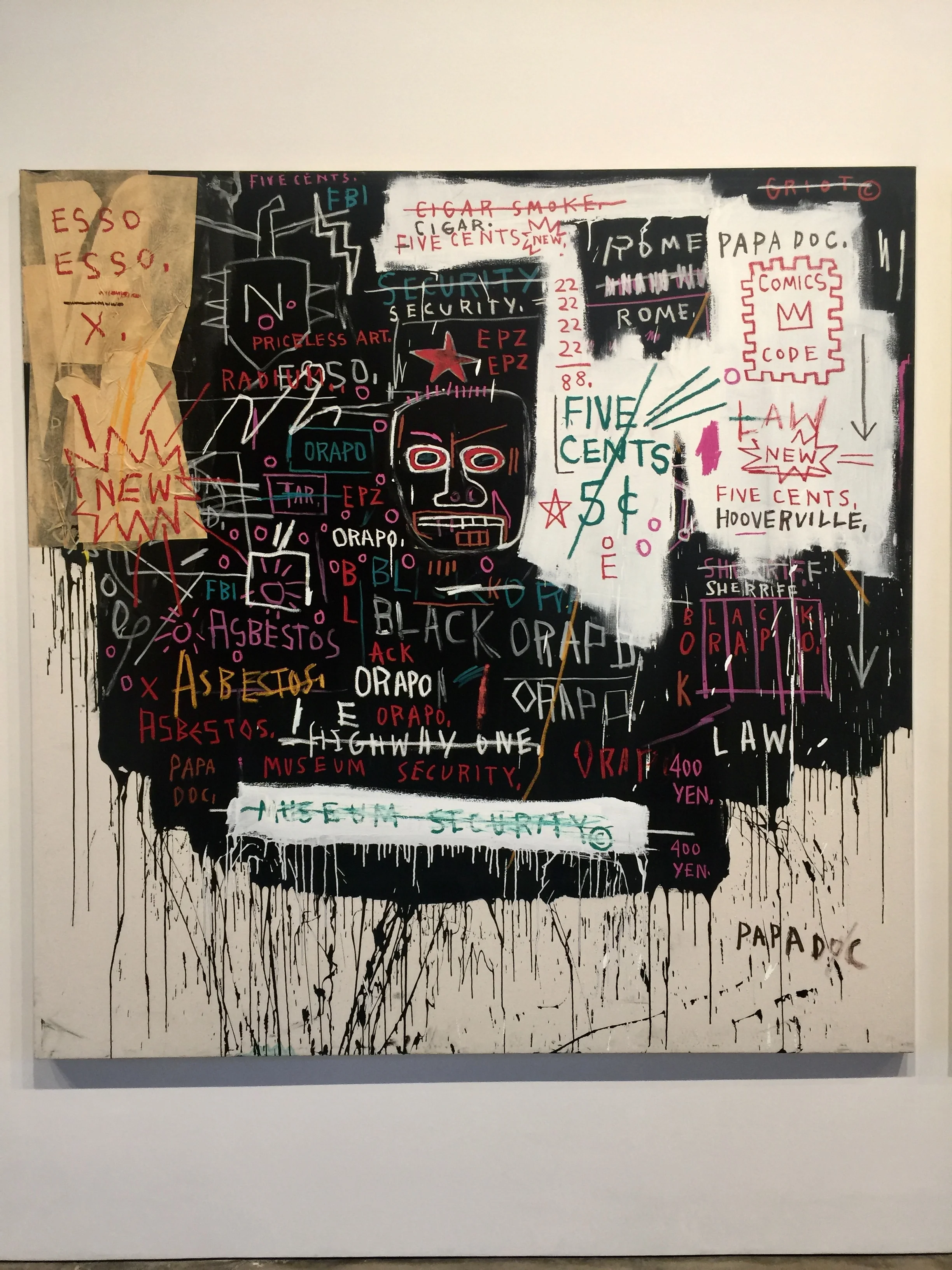 I arrived early. And I stood in line until my friend D got there to join me. By that time, other folks of color had joined the line, which had grown large enough that passerby stopped their morning strolls through the posh neighborhood to ask what we all were waiting for. “An art show,” I told one or two of them. “Jean-Michel Basquiat.” That was enough to elicit some semi-familiar (if self-conscious) smiles and some expressions of joy that this building was being put to good use, apparently for a cause interesting enough that such a queue would form for it.